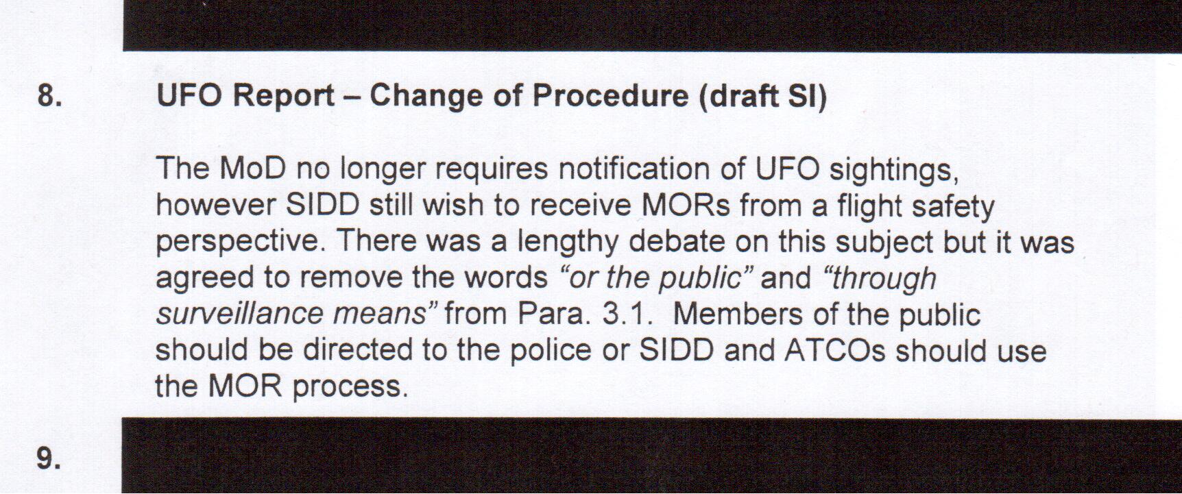 Members of the CAA Safety Regulation Group met at Gatwick airport to discuss the changes on 11 March 2010. According to a copy of the minutes I obtained (see extract below) there was a lengthy debate on the subject after which CAA decided to update its guidance to air traffic controllers on how to handle UFO reports in future.