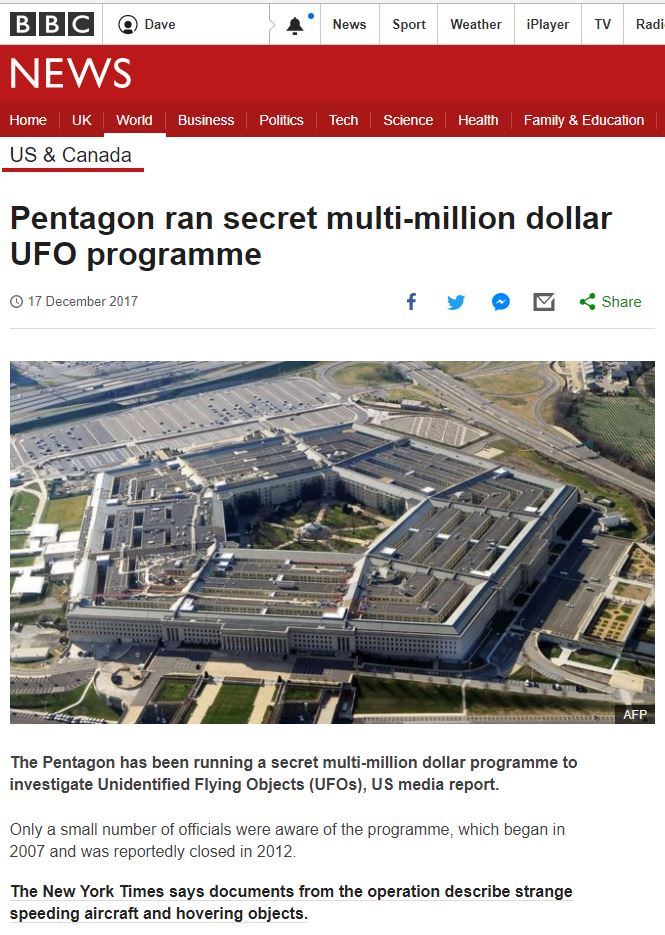 BBC report on the secret Pentagon UFO study 2017