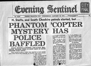 The mystery took an unexpected turn early in January 1974 when dozens more sightings poured into police stations in Derbyshire and Cheshire. On one occasion detectives searched fields near Jodrell Bank telescope after the chopper appeared to land, but it took off before they could reach it.  According to the police the helicopter was only active in the early hours and swooped as low as 100ft, sometimes without lights and on other occasions used a searchlight to pick out pylons and hillsides.