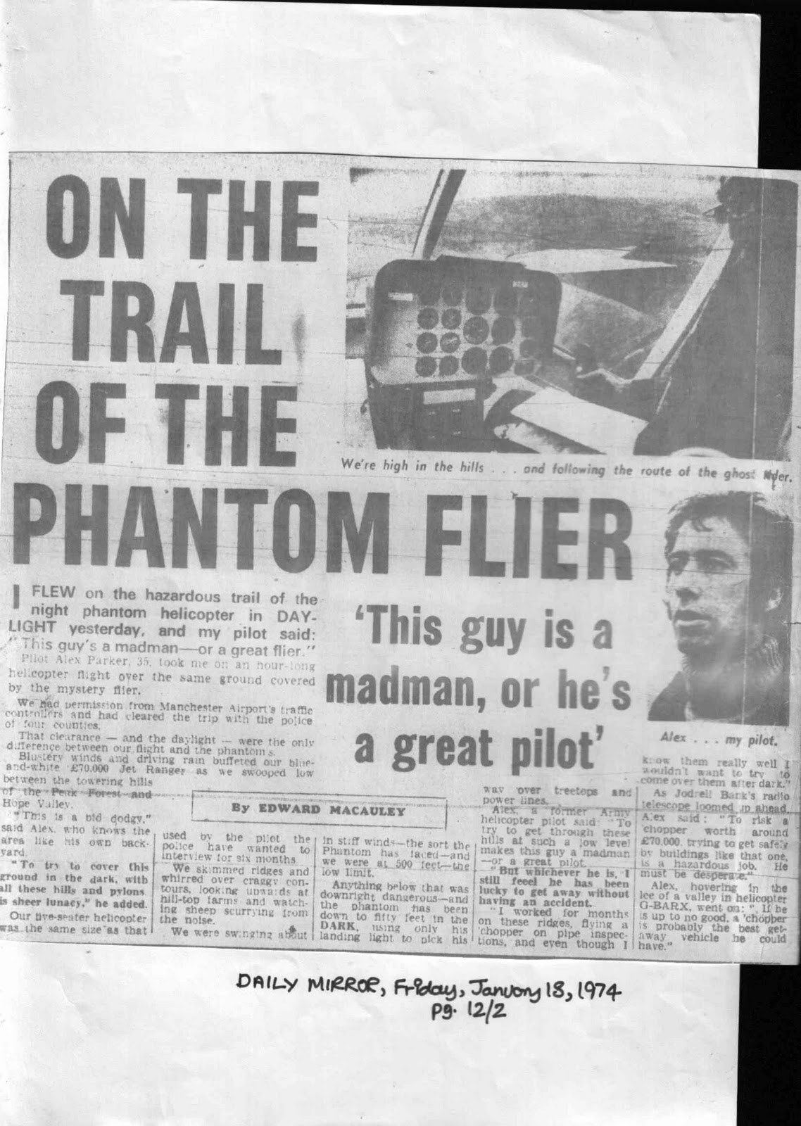 Tabloid headlines were dominated by news of the unfolding drama. Rumours spread linking the midnight flights with terrorists, spies, drug smuggling and cattle rustling from the air. Most bizarre of all was one theory reported by the Daily Telegraph that “it might be a ‘home-made’ helicopter which the owner, unable to obtain an air-worthiness certificate, if flying dangerously at night, or…it might be a modern – and wealthy – lover who finds it the most convenient way to reach his mistress or girlfriend.” The espionage theme was a favourite of the Daily Mirror who described the flier as “a devil-may-care pilot”. It said the scare had “all the drama of a James Bond spy spectacular.” Mirror reporter Ed Macauley took a flight in a private Jet Ranger during daylight over the High Peak and was told by ex-Army pilot Alex Parker that “to try to get through these hills at such a low level makes this guy a madman – or a great pilot. Whichever he is, I still feel he has been lucky to get away without having an accident.”
