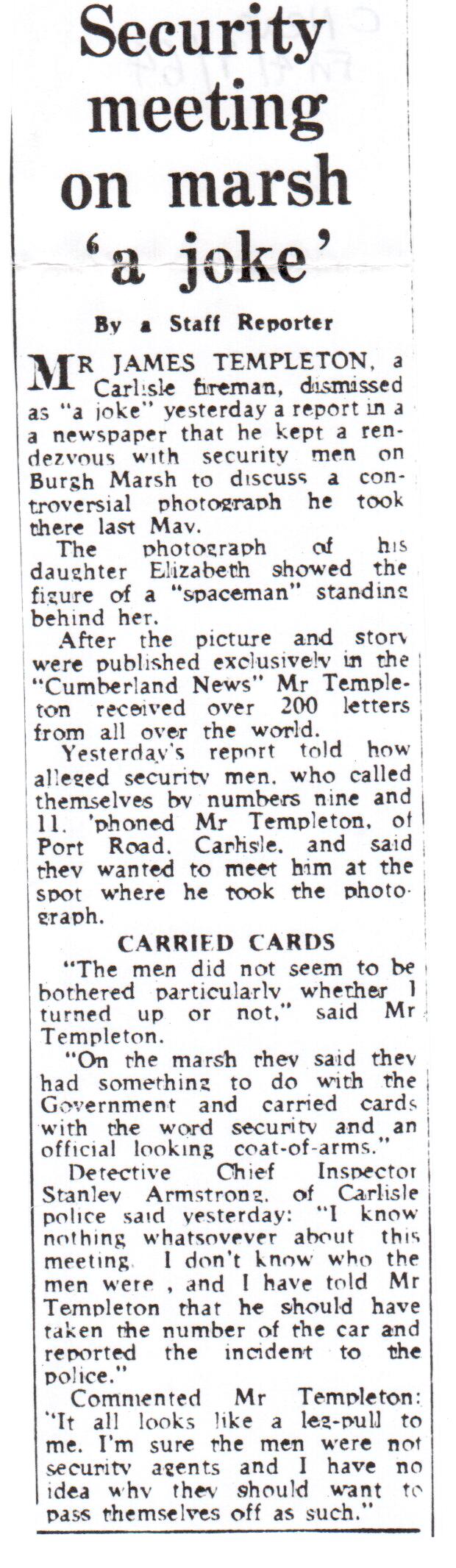 No real evidence of any connection between these events, or indeed proof that a similar ‘figure’ was ever seen at Woomera, exists. UFOlogists have never let UFO fact get in the way of UFO fiction and an air of mystery still pervades these claims. The story of the Solway Spaceman has become a UFOlogical legend. But there is another much more interesting view of the story and one which, while it may not solve the case entirely, could, once and for all, cast reasonable doubt on Jim’s claims that the photograph and the MIB story is genuine. Contemporary newspaper records from 1964 reveal that Jim Templeton took a very different view of the matter shortly after he had taken the infamous photograph. In September that year his story of the MIB visit reached the national media and journalists asked the Carlisle police for confirmation that Jim has been quizzed by the security services.