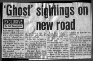 Both men leapt out of the car and searched the area and the banking surrounding them without finding a trace of a joker. The pair then drove further along towards the bridge itself and parked with the intention of using their radio to call for assistance. Before they could do so, the patrol car they were sitting in was jolted by a series of loud thumps as if something was impacting upon the boot. By now scared stiff, the two officers turned their car around and headed back down into the steelworks and safety. The following day PC Ellis made an official report to his superiors describing ‘inexplicable phenomena’ on the Stocksbridge bypass. Soon the story reached the press and appeared on the front page of the local evening newspaper the Sheffield Star. Despite the dose of light-hearted ribbing they received from friends and colleagues in the build-up to Hallowe’en both men stuck with their story which has never changed. Six years later, when a TV company visited the area to film a documentary on the experience PC Ellis said: