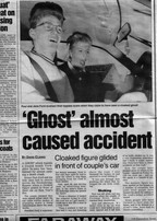 ‘I couldn’t actually see an outline or any facial expression and there were no clothes as such, it was just a grey outline of a person. I could see a head and shoulders, with arms and legs flying everywhere. It was just running aimlessly across the field and I thought it was a jogger until I realised that it wasn’t actually touching the ground. It was around three feet above it. There is an embankment that comes up to the road and it leapt from the field over the embankment and landed in the middle of the road in front of us. It seemed to hit the car and just vanished. I just screeched to a stop and it just seemed to melt into the car and all of a sudden it was gone. I looked at David and said “What’s happened? It’s just gone,” and we got out and looked around but we could not find any trace of anything. We were both left really shocked and upset and I could not believe what had happened. All I could think was that it must have been a ghost, whatever a ghost is.’